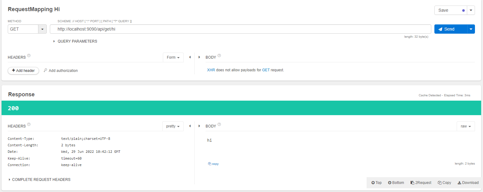 @RequestMapping(path = "/hi", method = RequestMethod.GET) // get http://localhost:9090/api/get/hi