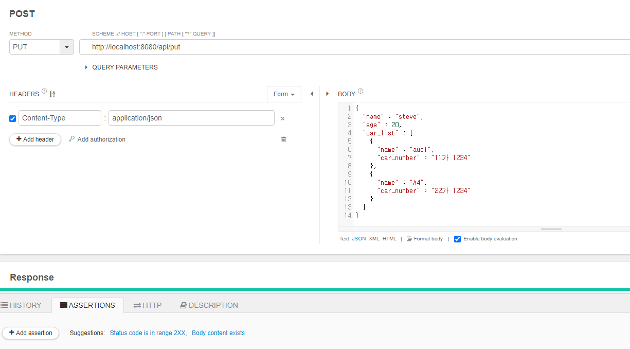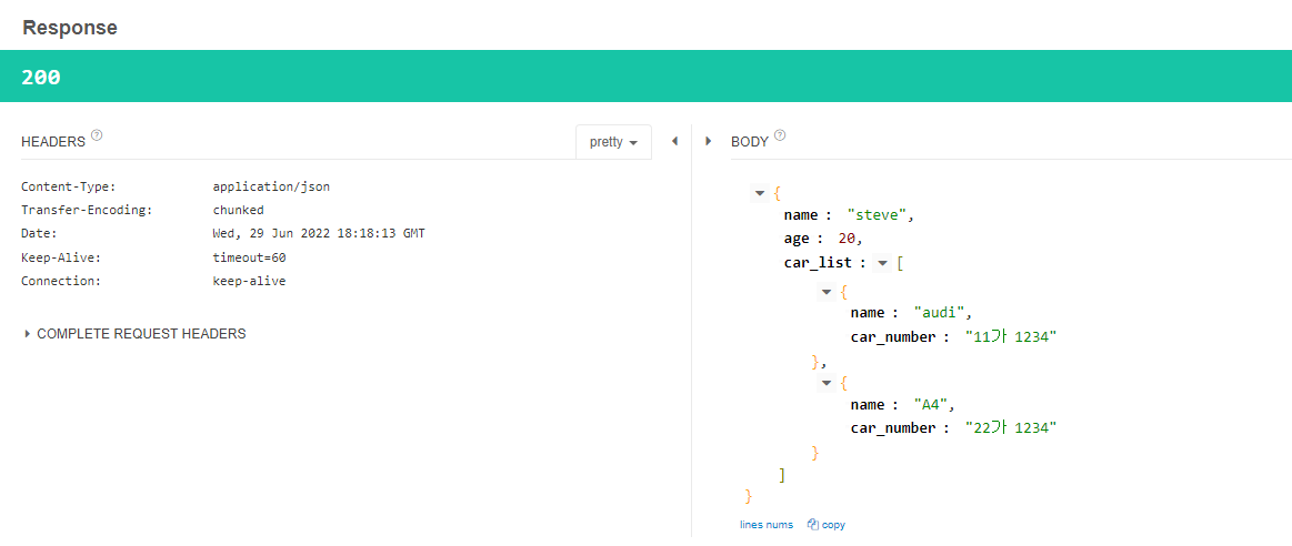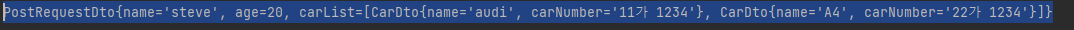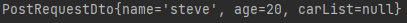 PostRequestDto{name='steve', age=20, carList=[CarDto{name='audi', carNumber='null'}, CarDto{name='A4', carNumber='null'}]}