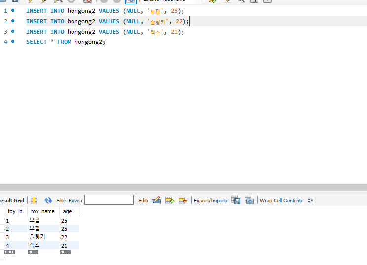 INSERT INTO hongong2 VALUES (NULL, '렉스', 21);