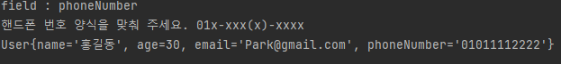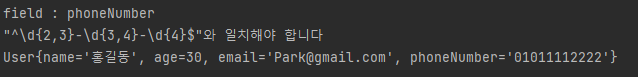 @Pattern(regexp = "^\\d{2,3}-\\d{3,4}-\\d{4}$", message = "핸드폰 번호 양식을 맞춰 주세요. 01x-xxx(x)-xxxx")