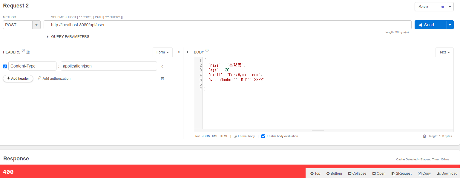 또한 파라미터에 BindingResult를 이용하여 예외가 바로 터지는 것이 아니라 bindingResult에 값을 가지게 하여 처리 할 수 있다.